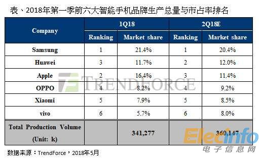 2018年第一季前六大智能手機(jī)品牌生產(chǎn)總量與市占率排名
