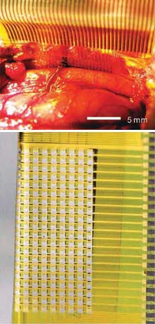 目前的技術(shù)停滯不前,只能制作每平方厘米大約8個(gè)傳感器的傳感器陣列;而里特與伊利諾伊大學(xué)厄巴納香檳分校(University of Illinois Urbana-Champaign)的一位材料科學(xué)及工程學(xué)教授約翰·羅杰士(John Rogers)合作,研發(fā)出一種新型陣列。該陣列可以在同樣大小的空間里容納360個(gè)傳感器。為了創(chuàng)造一種密集容納傳感器的小巧裝置,羅杰士將電子元件和硅晶體管整合進(jìn)入陣列本身,大幅降低了配線(xiàn)數(shù)量。