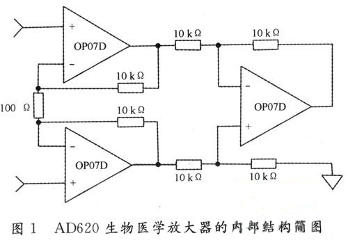 為此,選用Analog公司的儀用放大器AD620作為前級(jí)放大(預(yù)放)。AD620的核心是三運(yùn)放電路(相當(dāng)于集成了三個(gè)OP07運(yùn)放),其內(nèi)部結(jié)構(gòu)如圖1所示。