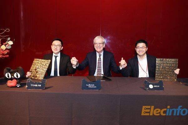 天貓平臺事業(yè)部總經(jīng)理劉博(左),大英博物館理事會主席Sir Richard Lambert及品源文華CEO何一贊(右)