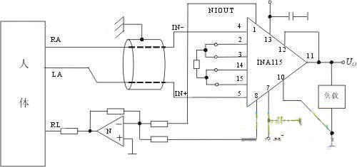 圖 1是INA115在心電檢測(cè)電路中的實(shí)用電路。放大器的正負(fù)輸入通過心電傳感器分別接到人體的左臂(LA)與右臂(RA)上,與運(yùn)放N和電阻R1~R4組成的驅(qū)動(dòng)網(wǎng)絡(luò)接到人體的右腿(RL)上,構(gòu)成“浮地”。由于生物信號(hào)很弱,加之有極化電位,所以該級(jí)的放大倍數(shù)不宜太高,一般取在10~100之間,并且只能作為前置放大用,為了檢測(cè)安全,后級(jí)一般應(yīng)再采用隔離放大電路進(jìn)行隔離,且該級(jí)的電源電壓最好應(yīng)采用隔離電源模塊進(jìn)行提供,以達(dá)到電源及信號(hào)的完全隔離。如圖2所示,