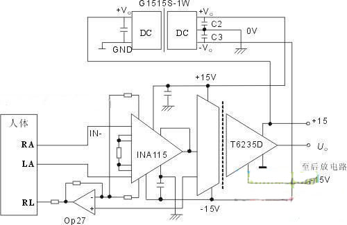 放大器的工作電源應(yīng)用選擇有足夠的安全爬電距離,較高的隔離電壓特性以及極低的隔離電容值,使到系統(tǒng)的安全性能得到較好的保障,此處推薦采用金升陽公司6000VDC隔離G系列(定壓輸入,隔離6000VDC正負(fù)電壓輸出)或H系列產(chǎn)品(定壓輸入,隔離6000VDC單路電壓輸出),該系列產(chǎn)品由于其極高的隔離電壓特性(6000VDC)且其具有極低的隔離電容值(≤10pF)被廣泛地應(yīng)用于醫(yī)療電子器械行業(yè)中。采用G1515S-1W使得INA115與人體相接觸的地線與輸入電源線真正意義上斷開了,達(dá)到完全隔離的效果,即電源與信號(hào)的完全隔離。