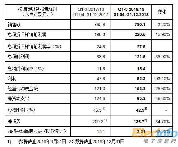 累計銷售額從7.659億歐元增至7.901億歐元,增漲3.2%。半導體封裝載板事業(yè)部與醫(yī)療健康板塊的銷售增長,部分抵消了移動設備、汽車和工業(yè)電子板塊在第三季度因需求下降所帶來的負面影響。受匯率影響,特別是美元疲軟,銷售額受到負面影響。而新會計準則(IFRS15)的實施對其產生了積極影響。