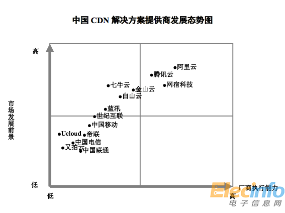 根據(jù)評估結(jié)果,得出中國CDN解決方案提供商發(fā)展態(tài)勢象限圖。報(bào)告中顯示,七牛云融合CND憑借高效率以及低成本的優(yōu)勢,在發(fā)展態(tài)勢象限圖中發(fā)展前景廣闊。
