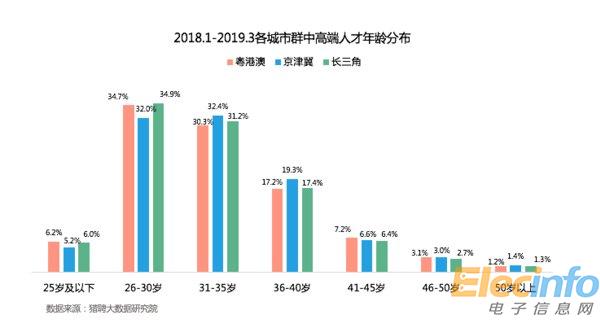 對(duì)比長三角和京津冀,粵港澳和長三角的中高端人才年齡分布呈現(xiàn)同步狀態(tài),其中26-30歲中高端人才占比都是最高,說明90后是這兩個(gè)城市群的主力軍。此外,相比粵港澳大灣區(qū)和長三角,京津冀中高端人才略顯年長,31-35歲中高端人才占比位居第一,占比為32.4%。