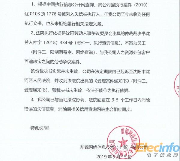關(guān)于網(wǎng)傳前錦網(wǎng)絡(luò)信息技術(shù)(上海)有限公司被沈陽(yáng)市沈河區(qū)人民法院列為失信被執(zhí)行人名單的不實(shí)報(bào)道,前程無(wú)憂鄭重說(shuō)明如下: