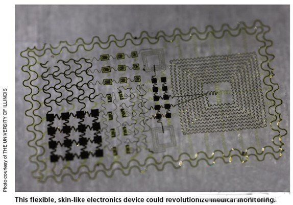 醫(yī)生們都希望能夠在病人離開醫(yī)院之后,仍能在其日常生活中對其病情進行監(jiān)測。隨著佩戴電子裝置取得突破,他們的這一愿望也許終將在某天成為現(xiàn)實。伊利諾大學( University of Illinois )材料科學工程教授John Rogers、加州大學圣地亞哥分校(University of California-San Diego)生物工程教授Todd Coleman和伊利諾伊州西北大學(Northwestern University)機械工程教授Yonggang Huang帶領(lǐng)研究小組開發(fā)出了一款安裝有微型電子元器件的薄且柔韌的裝置。