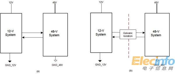 圖1. 12V和48V系統(tǒng)之間的直接和電隔離連接