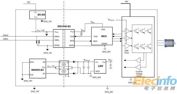 圖3. 這款48V啟動發(fā)電機(jī)采用隔離式CAN收發(fā)器和推挽式隔離電源