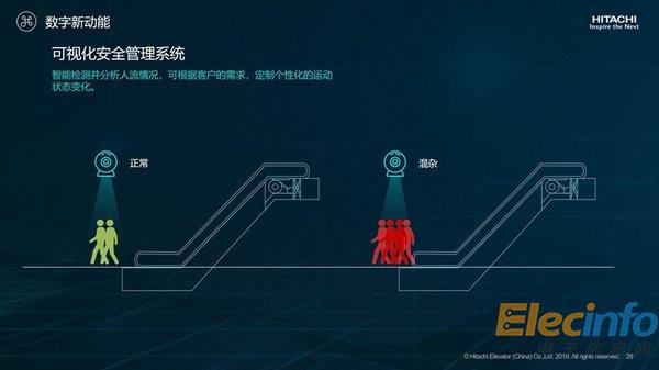 在大數(shù)據(jù)時(shí)代,智能技術(shù)和大數(shù)據(jù)的結(jié)合應(yīng)用,令電梯的可視化管理得以實(shí)現(xiàn)。針對(duì)中國(guó)城市軌道交通客流量大且變化性強(qiáng)的特點(diǎn),日立電梯打造的可視化安全管理系統(tǒng)可智能檢測(cè)并分析人流情況:通過(guò)攝像設(shè)備拍攝扶梯上乘客行為的變化趨勢(shì),分析潛在的乘梯安全風(fēng)險(xiǎn)。一旦出現(xiàn)乘客滯留、擁擠或跌倒時(shí),人流解析系統(tǒng)將與扶梯控制系統(tǒng)聯(lián)動(dòng),啟動(dòng)扶梯的安全運(yùn)行模式,與此同時(shí),系統(tǒng)將危險(xiǎn)風(fēng)險(xiǎn)信息傳達(dá)至地鐵站內(nèi)的控制中心,通知站內(nèi)采取如疏散、停運(yùn)等措施。