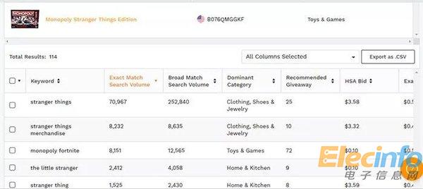 比如,想賣 "Stranger Things Dungeons & Dragons set" 這個桌游卡牌,輸入競品的ASIN(B076QMGGKF),可以看到一共有114個相關關鍵詞。其中搜索量排名第一的 "stranger things" 是個短尾詞,它的競價是$3.58。排名第三的關鍵詞monopoly fortnite精確搜索量大(8151次)且競價低($0.10), 值得添加到My Lists(自己的關鍵詞列表)里。