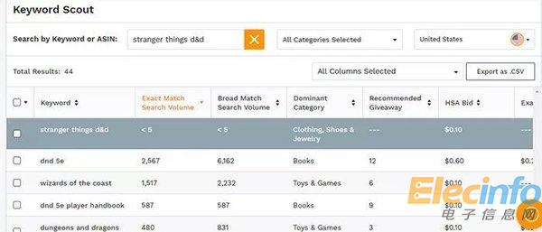 跟競品用的關鍵詞 "Stranger Things" 相比,這個方法搜出來的關鍵詞 "dnd 5e" 的競價低很多($0.60),CPC下降,轉化率也能提升很多!只要繼續(xù)在Keyword Scout返回的列表上找到至少25個類似的長尾詞,來彌補它們單個搜索量上的不足就可以了。值得一提的是,Keyword Scout的關鍵詞搜索量數(shù)據(jù)(Search Volume)不是“預測”數(shù)值,而是直接從亞馬遜平臺獲得的精準數(shù)據(jù),非常有價值。