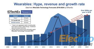 從不同類別的角度看,然后觀察這些設備在“可穿戴設備”旗幟下的更大的畫面,揭示了一些最近幾年非常有趣的趨勢。例如,IDTechEx追蹤一系列相關指標,以了解“行業(yè)狀況”,包括搜索趨勢、專利趨勢、投資數(shù)據(融資和輪數(shù))、產品發(fā)布數(shù)量以及報告中所列48種產品的關鍵收入和產品發(fā)貨量數(shù)據。當將趨勢指標匯總在一起時,就有可能看到可穿戴設備的清晰炒作曲線,在2015年達到頂峰,此后下降。這一炒作曲線實際上與整個行業(yè)的增長率相關,2014年至2015年達到36%的峰值增長率,但此后下降到每年10%至20%的區(qū)間。然而,盡管炒作明顯減少,但這一增長推動行業(yè)在這一時期的年度營收翻了一番。上圖總結了這些數(shù)據。