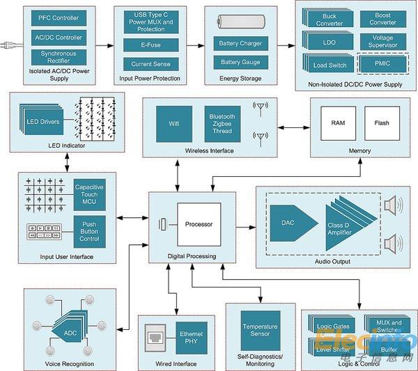 圖2:TI的典型帶屏智能音箱的系統(tǒng)框圖顯示了智能音箱的基本組件以及一些最新的添加件