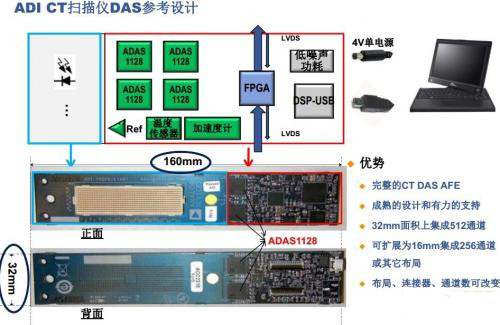 大型醫(yī)療設(shè)備里,CT機(jī)也是ADI重點(diǎn)涉足的一類,王勝給在場記者展示的CT掃描儀DAS參考設(shè)計(jì)在32mm寬度上集成512通道,根據(jù)需求也可擴(kuò)展為16mm集成256通道或其它布局。