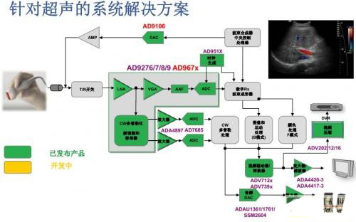 ADI針對超聲的系統(tǒng)解決方案,下圖中綠色部分已經(jīng)量產(chǎn),灰色部分也已經(jīng)在開發(fā)中。