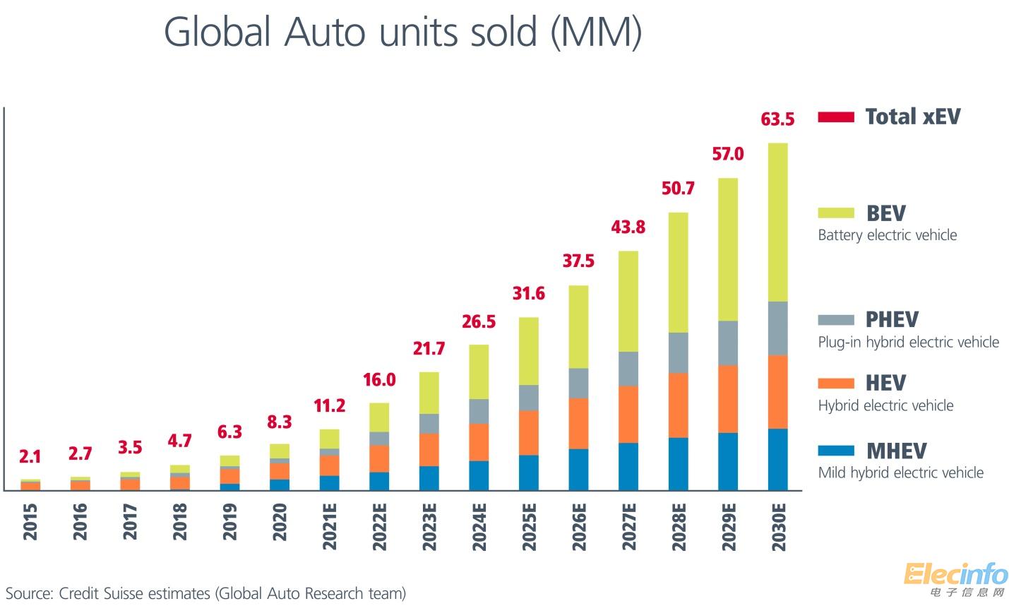 多年來,電動汽車的產(chǎn)量不足全球汽車總產(chǎn)量的 1%。瑞士信貸全球汽車研究中心團(tuán)隊(duì)數(shù)據(jù)顯示,這一比例將從 2020 年的 11% 飆升至 2030 年的 62%,全球汽車銷量將達(dá)到 6,300 萬輛。其中近一半(2900 萬)有望全面實(shí)現(xiàn)電氣化。