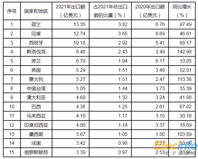 2、2021年鋰離子蓄電池出口前十大目的地(按出口額排序)