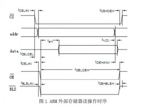 在本設(shè)計(jì)中,用到ARM 外部總線的信號(hào)有:CS.WE.OE.DATA[310].ADDR[230].BLS 等.CS 為片選信號(hào),WE 為寫(xiě)使能信號(hào),OE 為讀使能信號(hào),DATA 為數(shù)據(jù)總線,ADDR 地址總線,BLS 為字節(jié)組選擇信號(hào).ARM 的外部總線讀操作時(shí)序圖,分別如圖1 所示.