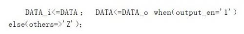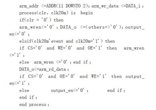 其中,DATA_i.DATA_o 和output_en 均為FPGA 內(nèi)部的信號(hào),在內(nèi)部的各層次模塊中,通過(guò)這三個(gè)信號(hào)就可以進(jìn)行單向的IO 控制.這樣,頂層設(shè)計(jì)中雙向的DATA 端口轉(zhuǎn)化為了內(nèi)部單向的DATA_i(輸入).DATA_o(輸出)和output_en(輸出使能).在內(nèi)部各模塊中,結(jié)合這三個(gè)信號(hào)以及 ADDR.OE.WE.CS 等信號(hào),則可方便地實(shí)現(xiàn)ARM 總線接口的功能.實(shí)現(xiàn)的VHDL 關(guān)鍵代碼如下: