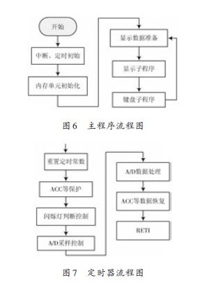 主程序要完成中斷系統(tǒng).定時器.用戶單元的初始化工作,其主要任務(wù)是進行鍵盤掃描和完成顯示.其具體流程如圖6所示.定時器中斷程序的任務(wù)是完成A/D 的采樣(采樣頻率),同時完成閃爍等功能,中斷程序流程如圖7所示.