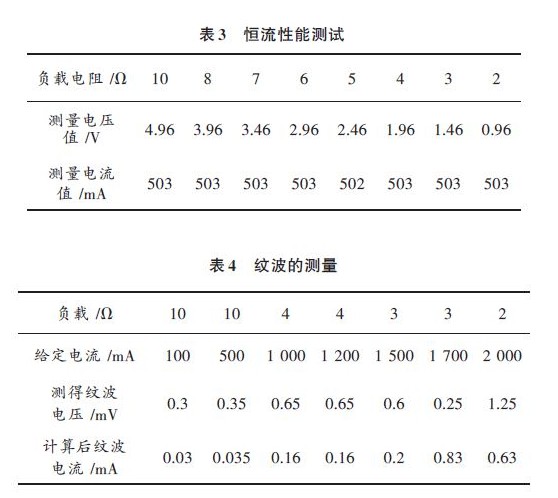 由表3 測試結(jié)果可看出,本系統(tǒng)達到以下的指標(biāo):改變負(fù)載電阻,輸出電壓在10 V 以內(nèi)變化時,輸出電流變化的絕對值不大于輸出電流值的2%+1 mA;由表4測試可看出,本系統(tǒng)達到了以下的指標(biāo):紋波電流≤1 mA.