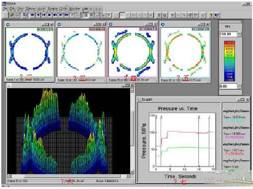 以下的案例是用I-Scan 系統(tǒng)對(duì)汽缸墊片中的一個(gè)燃燒環(huán)(Fire Ring)作組裝時(shí)壓力的分布狀況,以此來(lái)模擬該汽缸燃燒循環(huán)的狀態(tài),從而得到汽缸燃燒循環(huán)時(shí),發(fā)動(dòng)機(jī)上氣缸墊片的壓力大小和分布狀況。首先將I-Scan薄膜壓力傳感器置於發(fā)動(dòng)機(jī)面上和氣缸墊片的中間并用扭力扳手鎖緊。I-Scan軟件開(kāi)始測(cè)錄整個(gè)測(cè)試的過(guò)程,在測(cè)試的過(guò)程中,測(cè)試條件可被改變。不同的測(cè)試值將被顯示在電腦銀幕上以作分析。在圖二上可以清楚的看到壓力的不均勻分布與及較大的壓力出現(xiàn)在氣門(mén)環(huán)靠近栓固件的地方。用扭力扳手再對(duì)栓固件轉(zhuǎn)動(dòng)45度以加強(qiáng)緊固力量,然后錄下壓力值如圖三。同樣用扭力扳手再對(duì)栓固件轉(zhuǎn)動(dòng)45度以加強(qiáng)緊固力量,然后錄下壓力值如圖四。到此,已三次對(duì)發(fā)動(dòng)機(jī)加壓。接下來(lái)是三次的對(duì)發(fā)動(dòng)機(jī)減壓,來(lái)模擬發(fā)動(dòng)機(jī)的燃燒循環(huán)。壓力分布數(shù)據(jù)測(cè)錄在圖五。從圖五上可以看出發(fā)動(dòng)機(jī)上氣缸墊片的壓力有些許的下降,這是因?yàn)闅忾T(mén)在增壓時(shí)稍微撐起了氣缸墊片所造成的。圖六顯示了最后的測(cè)試結(jié)果。測(cè)試結(jié)束后,在圖七顯示了測(cè)試前和測(cè)試后的壓力比較圖,圖上顯示有將近5%的降壓現(xiàn)象。