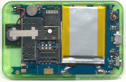 這款手機(jī)內(nèi)部沒有使用螺絲,各組件是咬合在一起的,基本沒有連接器,從顯示屏到電池,所有都是直接焊接到電路板上,電池也沒有二次保護(hù)電路。最主要的兩個(gè)集成電路芯片是聯(lián)發(fā)科MT6250DA和Vanchip VC5276。
