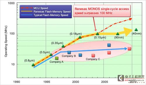 下圖為瑞薩電子MCU發(fā)展時間-閃存讀取速度圖:可以看到,到2010年,瑞薩MCU芯片大小為40納米,響應頻率大大超過100MHz(紅色虛線)。而傳統(tǒng)MCU芯片供應商(藍色實線)產品的閃存讀取頻率仍低于40MHz,很大程度上限制了芯片的性能發(fā)揮。