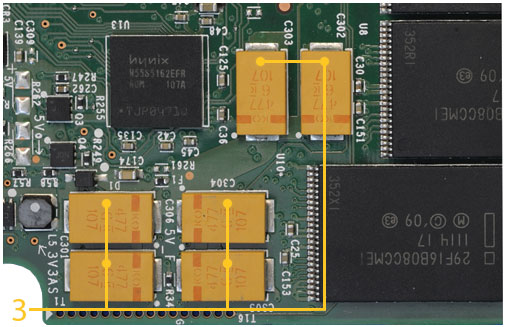 每個NAND閃存器件封裝包含兩個堆疊的64Gb、25nm L74A NAND閃存裸片,因此每個封裝容量為128Gb??偟拈W存容量實際上是320GB,因此具有很高程度的預(yù)留空間。