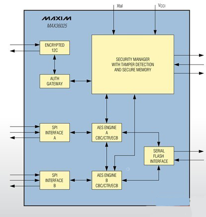 MAX36025利用兩個(gè)硬件AES引擎將加密操作移至硬件完成,從而大大縮短設(shè)計(jì)時(shí)間、提升安全等級(jí),將系統(tǒng)設(shè)計(jì)人員從極為耗時(shí)的加密軟件編程、調(diào)試工作中解放出來。此外,軟件加密還存在安全漏洞,未被檢測出的錯(cuò)誤會(huì)成為病毒的攻擊對(duì)象。MAX36025的雙AES引擎可分別用于獨(dú)立的通道保護(hù),以保護(hù)不同網(wǎng)絡(luò);也可以在同一通道上同時(shí)使用兩路加密,以提供更高的安全保護(hù)等級(jí)。