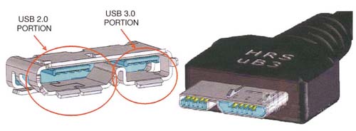 圖1,在USB 3.0微型連接器中,USB 3.0線要通過USB 2.0連接器。該連接器尺寸大于USB 2.0連接器,從而引發(fā)了移動(dòng)設(shè)備制造商的關(guān)切。