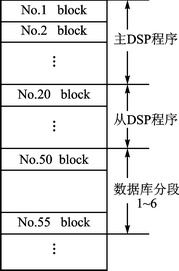 Flash內(nèi)部分為256個(gè)block,可以擦寫任意位置的block段,沒有擦寫的block數(shù)據(jù)不會(huì)丟失。根據(jù)這一特性,把兩片DSP軟件程序和分段的數(shù)據(jù)庫(kù)的燒寫位置分開。Flash空間地址分配如圖2所示。
