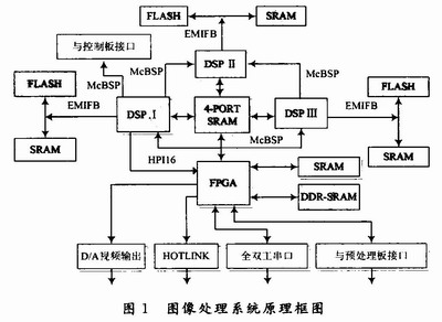 圖像處理系統(tǒng)主要包括DSP及其周邊電路,F(xiàn)PGA電路,四端口存儲器電路、顯示電路、HotLink接口電路等。圖1所示為圖像處理系統(tǒng)的原理框圖。