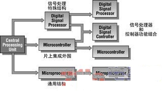 數(shù)字信號控制器(DSC)已開始在處理許多以往需由微控制器(MCU)和數(shù)字信號處理器(DSP)共同完成的復(fù)雜問題上嶄露頭角。作為這兩種器件的一種混合,DSC隨時準(zhǔn)備加入它們的行列(見圖1)并將與其共存。