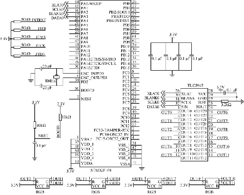 STM32F103通過TLC5947與LED連接[3],用來控制旋轉(zhuǎn)板上LED燈的顯示。例如可以通過單片機STM32F103控制LED燈旋轉(zhuǎn)顯示時鐘模樣或各種圖形[4],如果條件允許的話,可以顯示一些簡單的游戲。LED與ARM處理器相連接,通過ARM處理器對觸摸信號的處理來實現(xiàn)LED燈的顯示樣式的變化,從基態(tài)的指針式時鐘變?yōu)閿?shù)字顯示式以及改變其顯示的背景,還可以進行時間的校準(zhǔn)操作。TLC5947驅(qū)動旋轉(zhuǎn)LED屏顯示控制電路如圖1所示[5]。