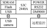 攝像機(jī)硬件核心采用三星公司推出的基于ARM9架構(gòu)的S3C2440A芯片,該處理器主頻達(dá)到400 MHz可以滿足實(shí)時(shí)壓縮,MJPEG視頻流可以達(dá)到320×240分辨率25 fps的性能要求。外圍搭配64 MB SDRAM、256 MB NAND Flash,網(wǎng)絡(luò)功能由DM9000以太網(wǎng)MAC控制芯片負(fù)責(zé)