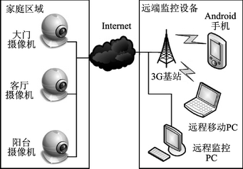網(wǎng)絡(luò)攝像機(jī)是互聯(lián)網(wǎng)上的TCP/IP設(shè)備,系統(tǒng)網(wǎng)絡(luò)拓?fù)鋱D如圖2所示。其中在家庭區(qū)域內(nèi)根據(jù)安防的特點(diǎn)在大門走廊、客廳內(nèi)、陽臺(tái)區(qū)域分別布置攝像機(jī),再由網(wǎng)線連接到路由器,配置路由器參數(shù)映射每個(gè)攝像機(jī)獨(dú)立端口與IP地址,即完成Internet接入。遠(yuǎn)端由固定位置的PC機(jī),移動(dòng)位置的3G筆記本和隨身攜帶的3G Android手機(jī)組成,PC機(jī)可以通過WEB瀏覽器訪問與控制網(wǎng)絡(luò)攝像機(jī),Android手機(jī)通過客戶端實(shí)現(xiàn)實(shí)時(shí)訪問。