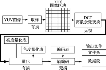 人眼視覺生理特性決定眼睛對(duì)構(gòu)成圖像的不同頻率成分具有不同的敏感度。JPEG壓縮是有損壓縮[3],但損失的部分是人類視覺不容易察覺到的部分,利用眼睛對(duì)色彩域中的高頻信息部分不敏感的特點(diǎn),節(jié)省大量需要處理的數(shù)據(jù)信息。一幀原始圖像數(shù)據(jù)對(duì)其進(jìn)行JPEG算法編碼過程分兩大部分: