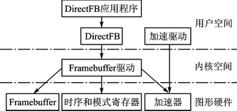 DirectFB必須通過Linux下Framebuffer驅(qū)動來訪問硬件設(shè)備,它在Framebuffer的基礎(chǔ)上提供了圖形設(shè)備的加速、輸入設(shè)備處理提取、透明窗口和多重顯示層的功能。另外DirectFB設(shè)計之初就充分考慮了嵌入式系統(tǒng)的固有特性,體積小巧,資源消耗低[2]。作為嵌入式系統(tǒng)中強大的圖形處理庫,DirectFB成為Linux下一代處理的一個新標準(CELF AVG1.0標準)[1]。圖1是DirectFB的整體框架。