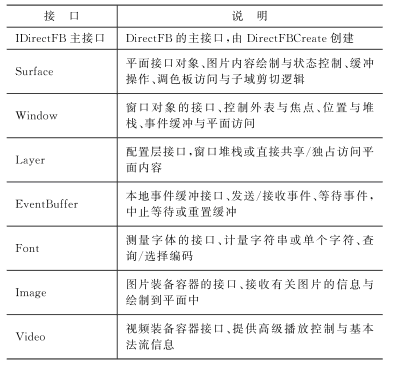 DirectFB提供了一套C接口來方便用戶進行界面開發(fā),例如IDirectFBSurface接口提供了對于文本、BILT、畫線以及畫矩形的操作。IDirectFBFont接口提供了對字體的操作,而IDirectFBVideo接口提供了對多媒體進行播放控制的操作。表1對DirectFB接口進行了詳細的描述。