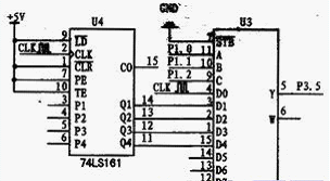 74LS161為二進(jìn)制同步計(jì)數(shù)器,具有同步預(yù)置數(shù)、異步清零以及保持等功能。合理應(yīng)用計(jì)數(shù)器的清零功能和置數(shù)功能,一片74LS161可以組成16進(jìn)制以下的任意進(jìn)制分頻器;74LS151是具有選通輸入端,互補(bǔ)輸出的8選1數(shù)據(jù)選擇器,數(shù)據(jù)選擇端(ABC)按二進(jìn)制譯碼,以從8個(gè)數(shù)據(jù)(D0~D7)中選取1個(gè)所需的數(shù)據(jù)。