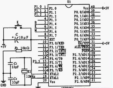 單片機(jī)系統(tǒng)的拓展通常是以最小系統(tǒng)為基礎(chǔ)的。信號(hào)處理模塊主要是依靠單片機(jī)的最小系統(tǒng)。最小系統(tǒng)是一個(gè)真實(shí)有用的單片機(jī)最小配置系統(tǒng)。對(duì)于AT89C51單片機(jī)而言,因?yàn)槠瑑?nèi)帶有程序存儲(chǔ)器,所以只要在芯片上外接復(fù)位電路和晶振電路就構(gòu)成了最小系統(tǒng)。單片機(jī)的XTAL1和XTAL2引腳是用來(lái)連接晶振電路的,XTAL1接外部晶振和微調(diào)電容的一端,它是內(nèi)部時(shí)鐘工作電路及振蕩器的反向放大器的輸入端;XTAL2接外部晶振和微調(diào)電容的器一端,在片內(nèi)它是振蕩器的反向放大器的輸出端。RST為單片機(jī)的復(fù)位端,接復(fù)位電路,該引腳為高電平時(shí)可使單片機(jī)復(fù)位,回到初始狀態(tài)。復(fù)位電路主要包括復(fù)位開(kāi)關(guān)、復(fù)位電阻和復(fù)位電容。單片機(jī)的最小系統(tǒng)如圖4所示。