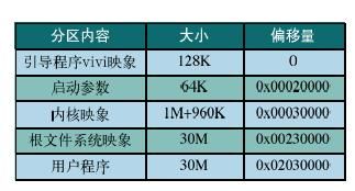 [3]編譯vivi/arch/s3c2410/smdk.c,根據(jù)實際板子的實際情況對NandFlash進行分區(qū)。需要注意的是要和下面Linux內核配置編譯配合起來。本開發(fā)板提供的64M的NandFlash做為存儲設備,其空間分配表如表1所示。