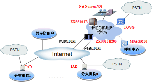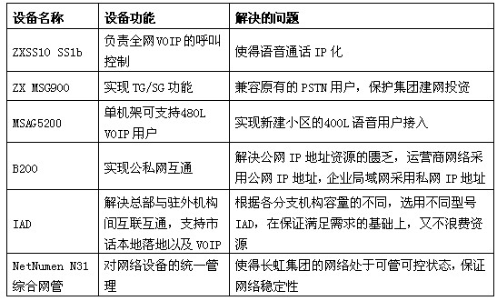 考慮到現網情況,及實際需求,中興通訊為四川長虹公司內部提供一套軟交換系統(tǒng)實現內部的VOIP功能,同時具備多媒體通信及寬帶接入能力。