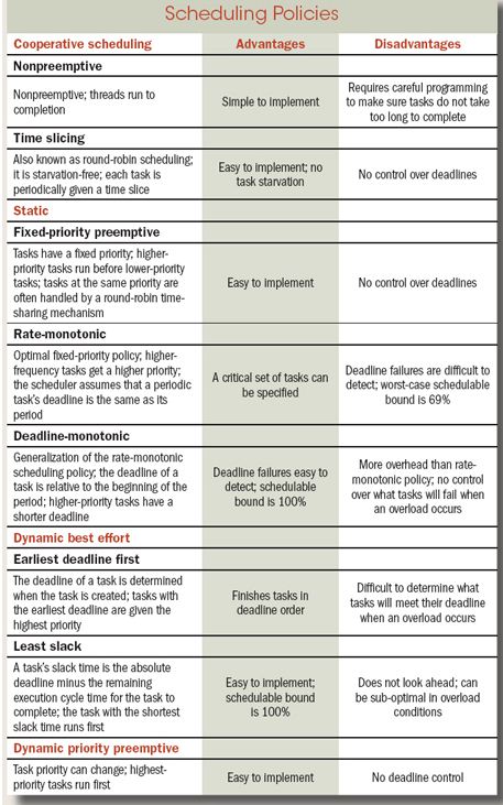 一個(gè)RTOS可以實(shí)現(xiàn)一系列調(diào)度策略,但應(yīng)用經(jīng)常會(huì)制約一個(gè)程序員的選擇(見(jiàn)表)。非優(yōu)先式調(diào)度(non-preemptive scheduling)的實(shí)現(xiàn)雖不重要,但在一些應(yīng)用中很有用。另一方面,任務(wù)內(nèi)的非優(yōu)先式調(diào)度可在優(yōu)先式系統(tǒng)的頂部實(shí)現(xiàn)。