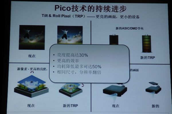 今年TI發(fā)布了兩項(xiàng)新一代的技術(shù):首先是像素架構(gòu)Tilt & Roll Pixel(TRP)。其將DLP整個(gè)像素的尺寸進(jìn)一步降低,帶來(lái)兩個(gè)特點(diǎn):第一,現(xiàn)在更小的面板可以實(shí)現(xiàn)原來(lái)的分辨率,更小的面積使得光學(xué)模塊可以做得更加緊湊;第二,TRP實(shí)現(xiàn)了復(fù)雜的偏轉(zhuǎn)方式,使像素有更高的光學(xué)效率,即使是光源在其他條件不變的情況下,亮度得到進(jìn)一步提升。它在不損失體積或功率的情況下,提升了亮度。