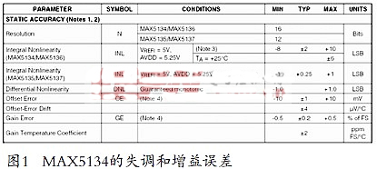 如上所述,很多誤差因素會(huì)影響DAC性能,比如失調(diào)誤差和增益誤差,DAC器件數(shù)據(jù)手冊(cè)的“靜態(tài)精度”參數(shù)部分顯示了這些因素的影響。圖1為MAX5134 16位、4通道DAC的規(guī)格。
