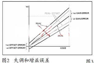 圖2給出了失調(diào)誤差和增益誤差,注意,失調(diào)和增益誤差可以為正,也可以為負(fù)。