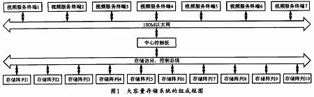 整個視頻壓縮與大容量數(shù)據(jù)存儲系統(tǒng)一般由多路視頻服務終端、中心控制分系統(tǒng)、大容量電子存儲陣列等組成。其中,多路視頻服務終端用于視頻信號的采集和壓縮,壓縮后的視頻數(shù)據(jù)通過網(wǎng)絡送入存儲陣列保存,也可以通過以太網(wǎng)送到指定的用戶進行瀏覽;中心控制分系統(tǒng)以高性能嵌入式處理器BF537為核心,可完成視頻服務終端的控制,存儲陣列數(shù)據(jù)的讀出。它通過百兆以太網(wǎng)與上位機進行高速數(shù)據(jù)交換;存儲陣列可提供高達4T的存儲深度,它由10塊400MByte容量的獨立存儲板組成,可為多路視頻服務終端提供同時存儲服務,存儲介質(zhì)采用大容量非易失NAND-Flash芯片K9WBG08U1M,單片存儲容量為32Gbit,每塊存儲板都可由視頻服務終端寫入,并由中心控制分系統(tǒng)讀出。其系統(tǒng)組成框圖如圖1所示。